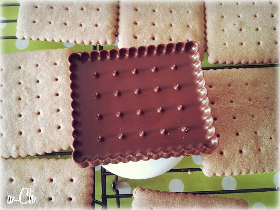 Para hacer las galletas, mezclamos el azúcar glass con la mantequilla (yo lo hice con cuchara de madera), hasta obtener una textura cremosa. Añadimos la yema de huevo y mezclamos bien. Tamizamos la harina, el sobre de pudín de chocolate (en su defecto Cacao) y la pizca de sal, se lo añadimos todo a la mezcla anterior hasta obtener una masa homogénea. Hacemos una bola, envolvemos en papel film y a la nevera Mientras coge un poco de frío la masa, precalentamos el horno 160ºC calor arriba y abajo. Cuando esté listo nuestro horno, estiramos con un rodillo la masa de galletas entre dos papeles de film o dos papeles de horno, marcamos con nuestro corta pasta todas las galletas. Las metemos en el horno a 150ºC unos 10 minutos aprox. (en mi horno), el mío calienta bastante, si ves que todavía no están hechas, dejalas un par de minutitos más, pero hay que estar pendientes. Sacamos nuestras galletas y las dejamos enfriar sobre una rejilla. Mientras deshacemos la tableta de chocolate a pequeños toques de calor en el microondas. Rellenamos con chocolate nuestro molde. Dejamos enfríar y a la nevera. Cuando se haya enfriado, sacamos con cuidado las tabletitas de chocolate y las ponemos sobre la galleta (yo como pegamento usé un poco de chocolate que me había sobrado, lo calenté un poco, puse un pegotito y encima la tabletita. Espero que os resulten sencillamente ESPECTACULARES.
