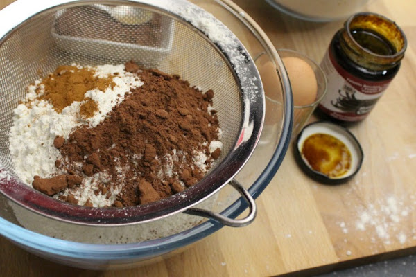 Mezclamos en un bol, tamizando, la harina, el cacao y la canela. Reservamos.