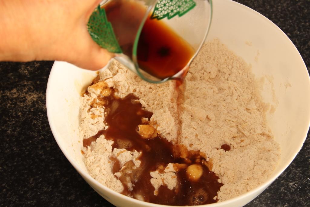En un bol echamos el azúcar y la mantequilla blanda, mezclamos bien con las manos y añadimos el resto de ingredientes secos, mezclamos de nuevo y por último añadimos el café.