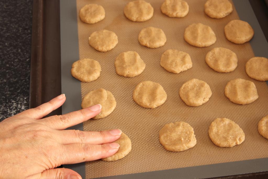 Hacemos pequeñas bolas con la masa, las dispnemos sobre la bandeja de horno forrada y las aplastamos un poco con los dedos, espolvoreamos el azúcar moreno y la canela. Horneamos a 180º, calor arriba y abajo durante unos 10 minutos, que queden tostadas por abajo.