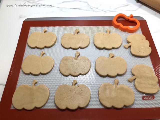 Se pueden hacer a mano o con robot de cocina. Yo las hice con la Kitchen Aid. Mezclar la mantequilla pomada con los azúcares hasta que estén integrados, sobre un minuto. Es importante no sobrebatir. De lo contrario quedará una masa con aire, no mantendrán la forma al hornearlas y aparecerán las temidas burbujas que afearán la superficie de nuestras galletas. Añadir el puré, los huevos y la vainilla batiendo lo justo para integrar. Siempre que sea necesario bajar la masa de las paredes con la ayuda de una espátula. Tamizar la harina, las especias y la sal juntas. Añadir a la mezcla y mezclar con la ayuda de un gancho unos 30 segundos (si usáis K.A. tapar con un trapo para no liarla parda). Acabar de integrar la harina y ya en en una superficie formar dos bolas. Sin amasar en exceso, sólo integrando, no queremos que el gluten haga su aparición. Extender cada bola formada de masa en un papel de horno, cubrir con otro y extender con la ayuda de un rodillo a la altura deseada, colocar en una bandeja y refrigerar al menos 1h. Sacar de la nevera, retirar el papel y cortar con vuestro cortador favorito. Yo he utilizado un cortapastas con forma de calabaza. Si queréis un paso a paso podéis visitar mi post de galletas básicas de mantequilla para decorar