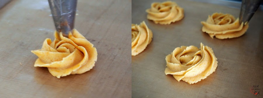 En una bandeja con papel de horno en la base, ir escudillando la masa en forma de roseta.