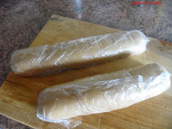 Retiramos la masa obtenida del bol, envolvemos en un trozo de papel film, dando forma de cilindro.