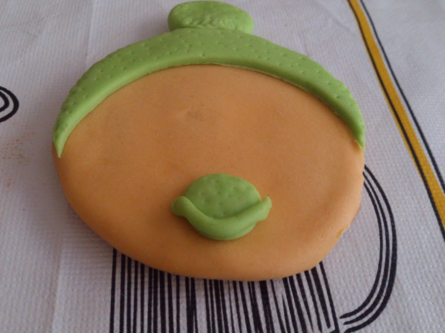 Pegas el fondant a la galleta con un poquito de agua (lo pincelas con un pincel)