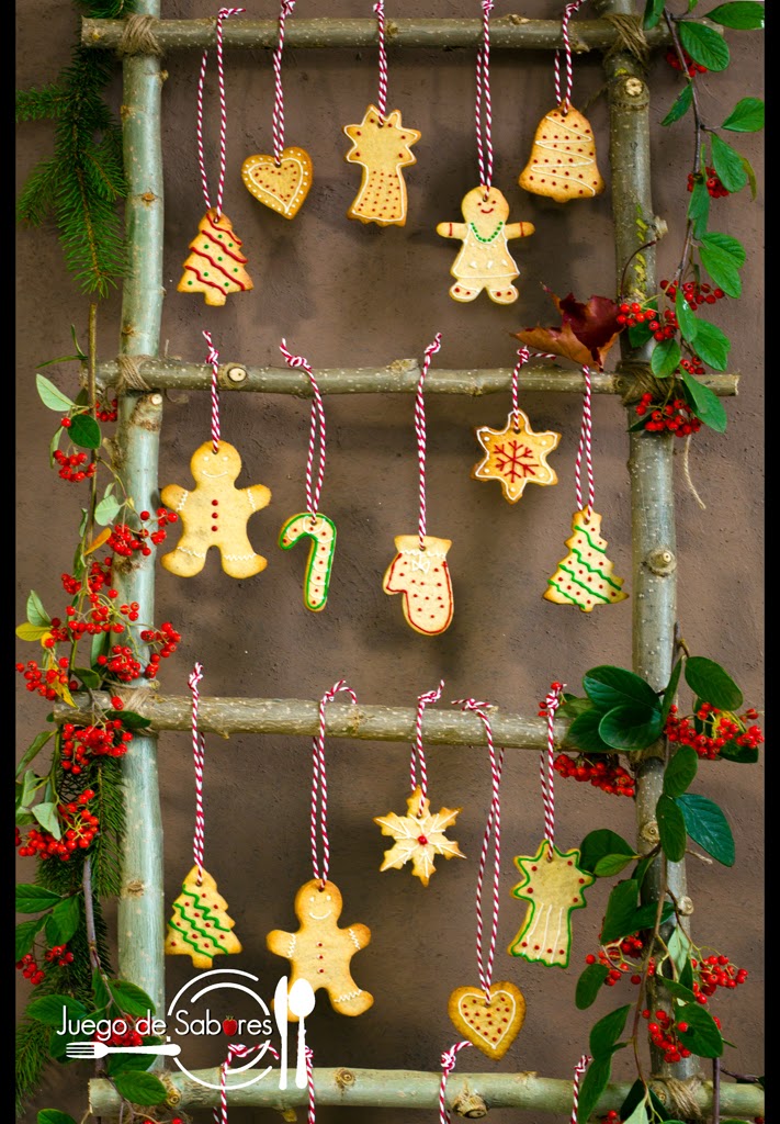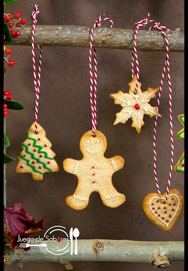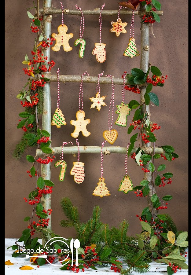A la que oyen que se acerca la Navidad los muñequitos, las campanas, las estrellas, los abetos y los corazones se me revolucionan. Todas estas galletas de canela quieren encaramarse a lo más alto de esta escalera de troncos para no perderse detalle de cuanto ocurra desde hoy hasta Nochevieja. Son inocentes porque no durarán tanto tiempo. Cada vez que uno de los miembros glotones de mi familia pasa por delante de la escalera acaba con una galletita en la boca. Está visto que si quiero llenar los peldaños tendré que hacer muchas más hornadas de galletas. Si llega a ser una escalera de bomberos me paso las fiestas encerrada en la cocina.