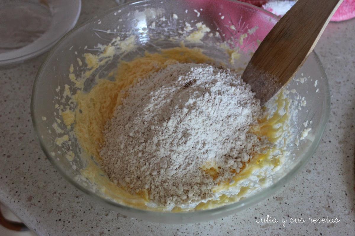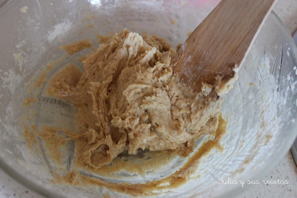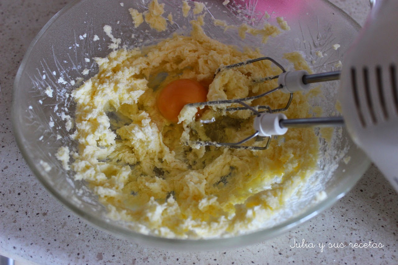 En un bol ponemos la mantequilla junto al azúcar y la batimos bien, añadimos el huevo y la esencia de vainilla, batimos hasta que esté todo bien incorporado.