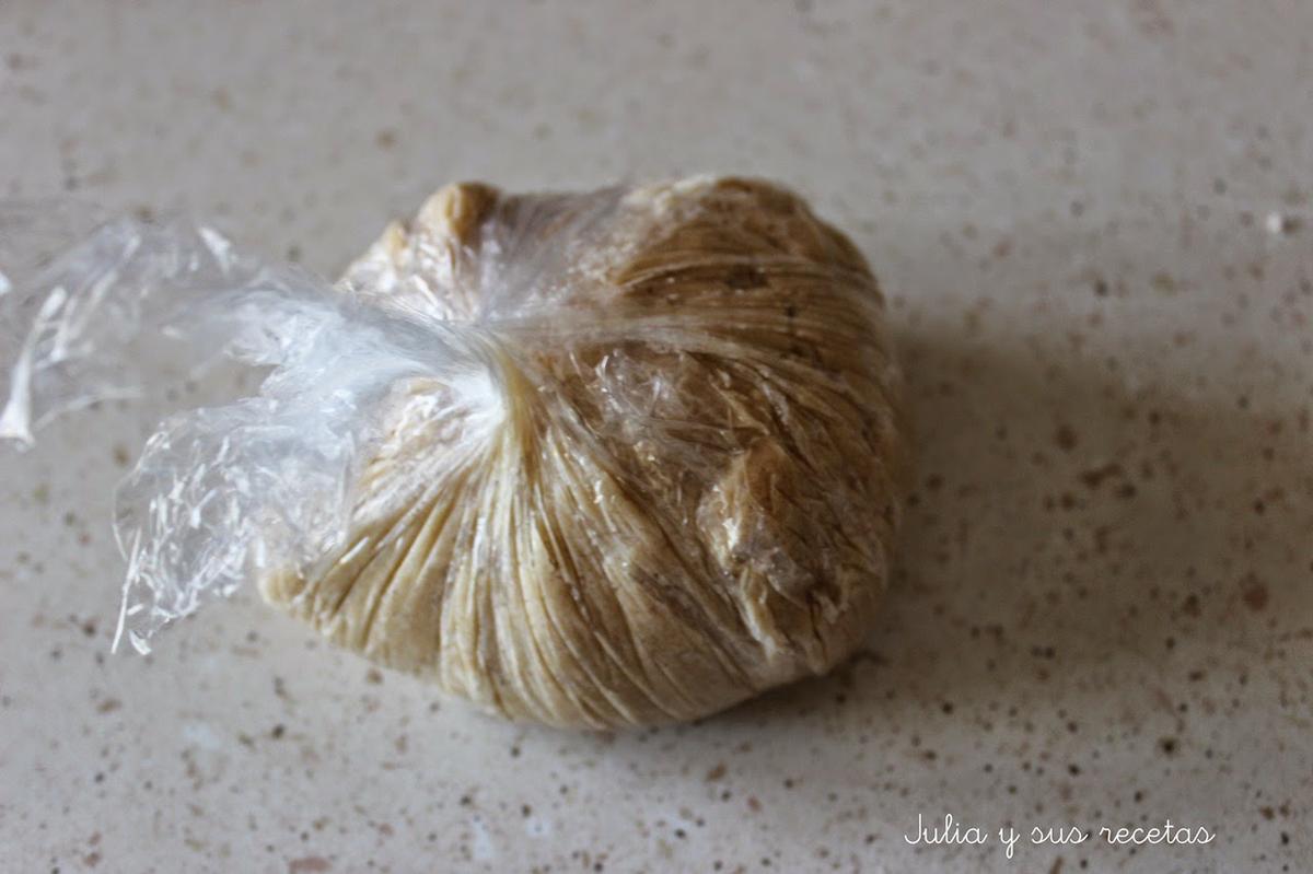Quedará una masa pegajosa, la ponemos en un film transparente y la dejamos en el frigorífico 2-3 horas para que tome consistencia.
