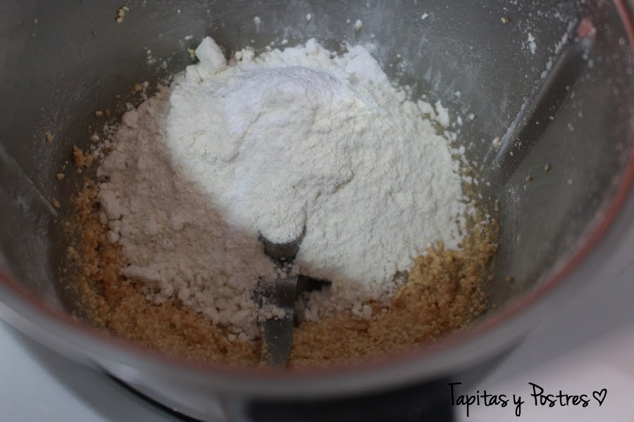 Agregamos ahora la harina y la levadura y mezclamos 30 segundos a velocidad 4. Quizá notéis que a la máquina le cuesta batirlo todo pues es una masa densa. Si es así, la sacamos del vaso y en un recipiente amplio la acabamos de mezclar.