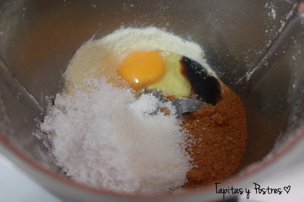 Añadimos las dos clases de azúcar, el huevo, la vainilla y el coco y batimos durante 30 segundos a velocidad 4.