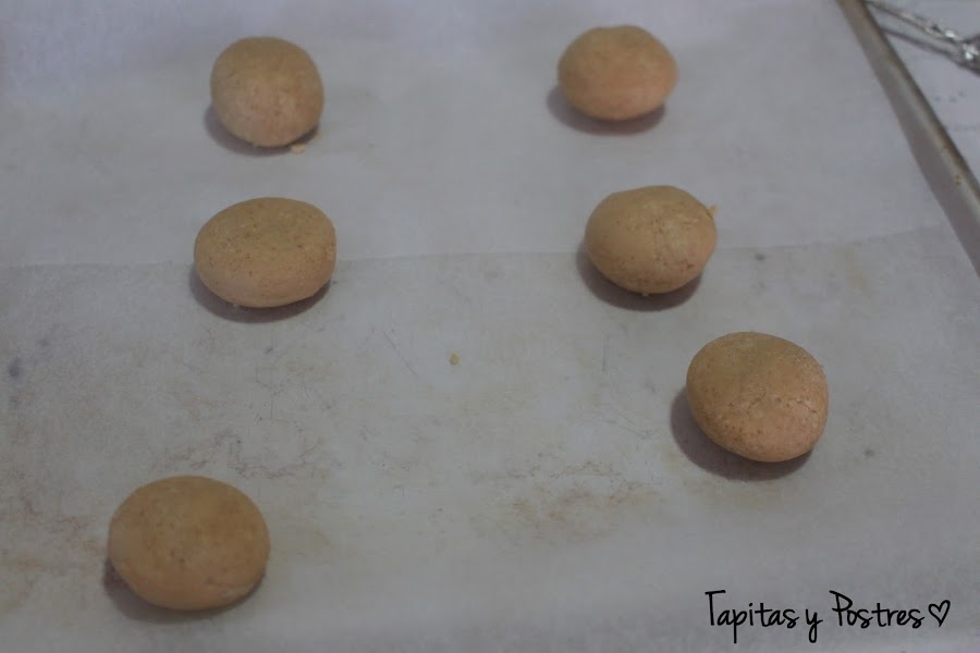 Ponemos las bolas en la bandeja y aplastamos suavemente. Dejad espacio entre ellas que en el horno se expanden.