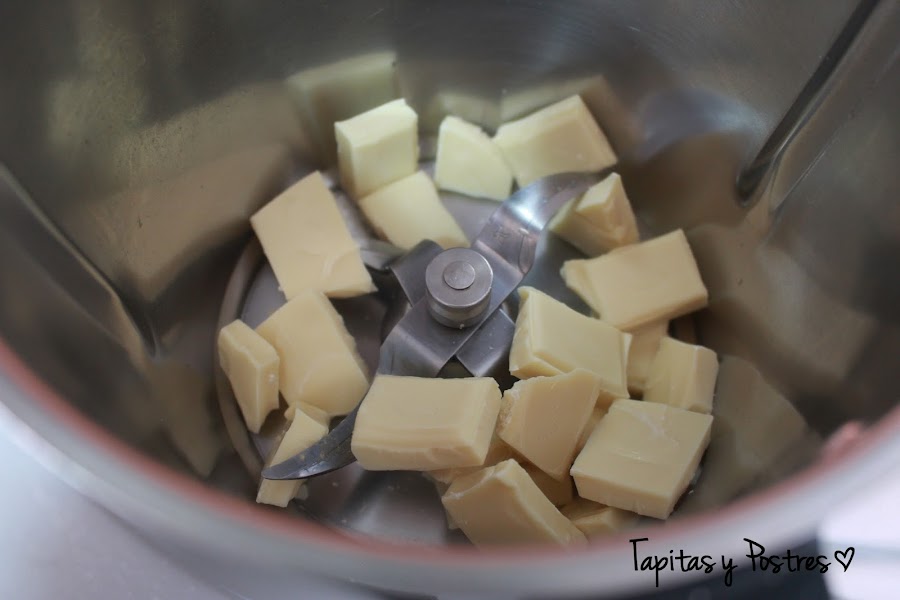 Primero vamos a pulverizar el chocolate en el vaso de la thermomix, 5 segundos a velocidad 8-10. Lo podemos hacer también con una picadora eléctrica.