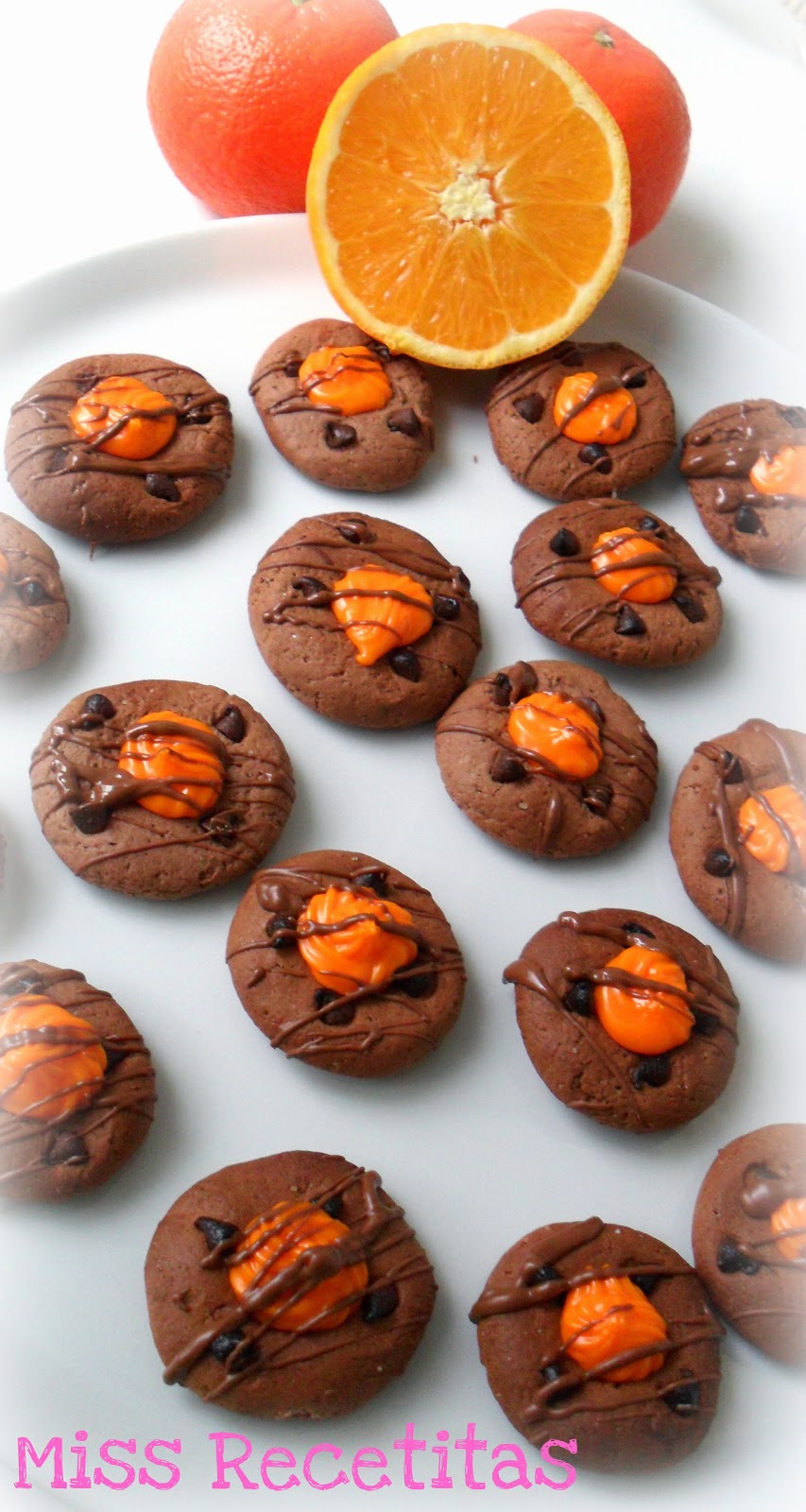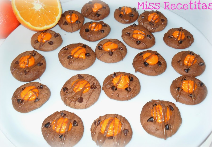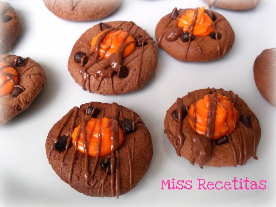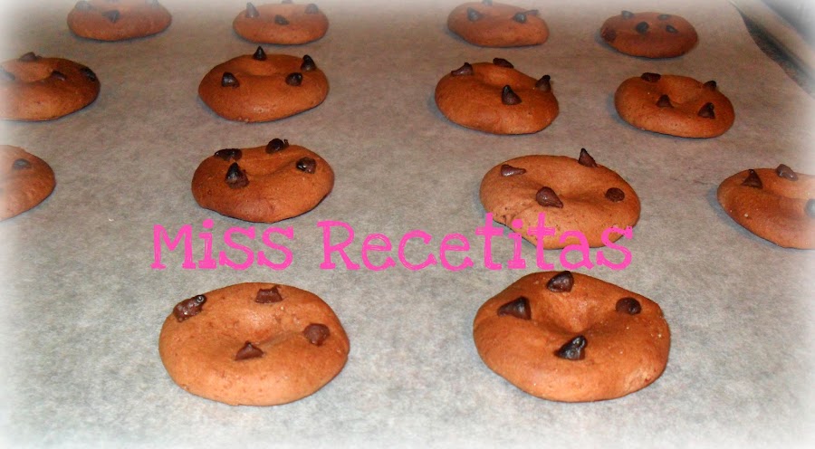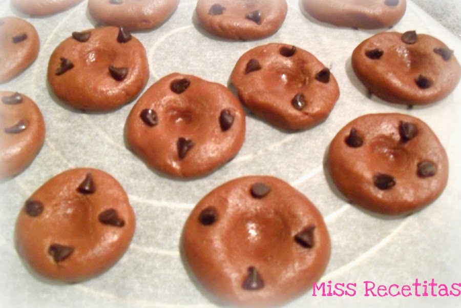 Hacemos bolitas con la masa y aplastamos con las palmas de las manos y con el dedo aplastamos el centro de la galletas para que nos quede mas hundido que los bordes. Colocamos unos gotitas de chocolate para adornar e introducimos en el horno unos 10 minutos.