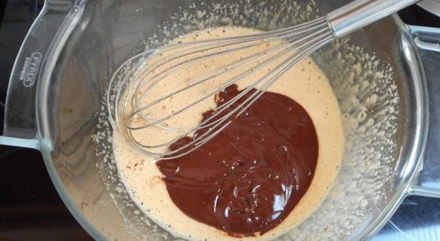 Echara a la mezcla del huevo la mezcla templada del chocolate.