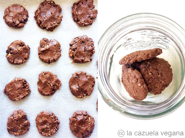 Introduce en el horno precalentado a 180ºC, a media altura, durante 9-11 minutos. Pasado este tiempo (aunque veas que siguen algo blandas, ya que luego cuando se enfríen se endurecerán), saca la bandeja del horno y espera un par de minutos para pasar las galletas a una rejilla y que se enfríen uniformemente.
