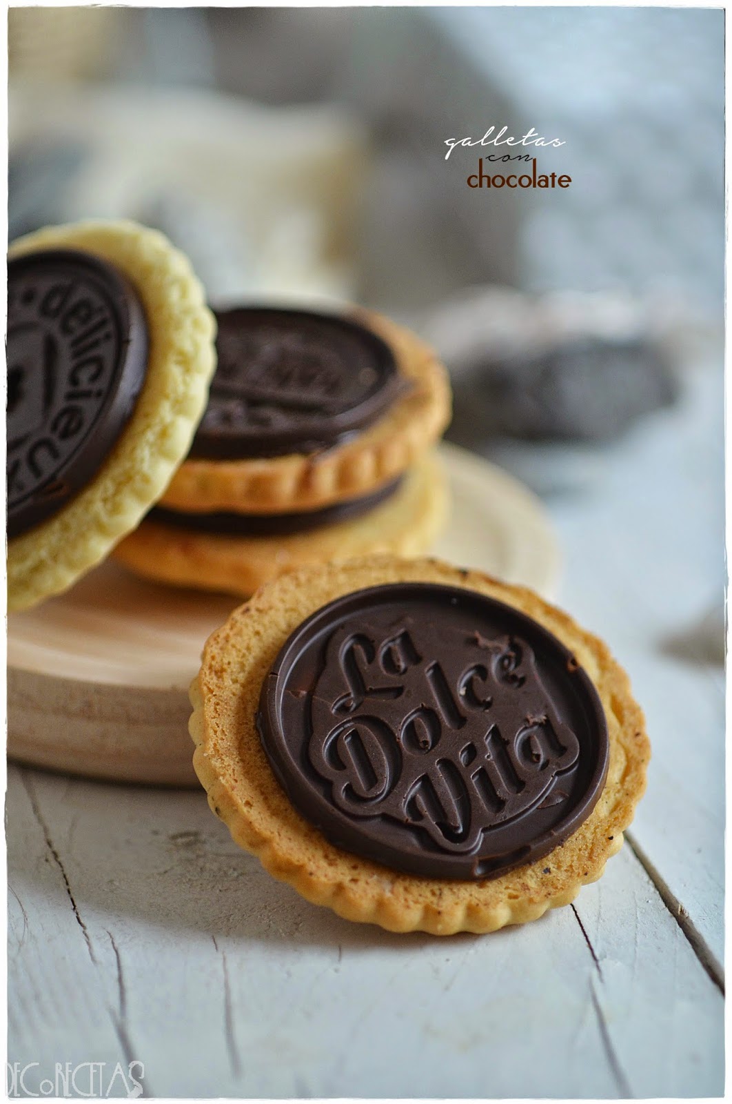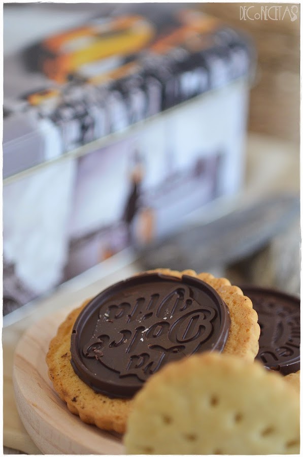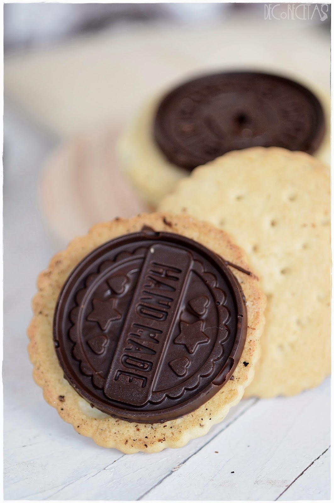 Por otra parte, derretimos el chocolate al baño maría, y rellenamos los moldes, dejándolos enfriar en el frigorífico. Para pegar en la galleta, añadimos una cucharadita de chocolate encima de la galleta, y presionamos con la estampación de chocolate ya endurecido encima.