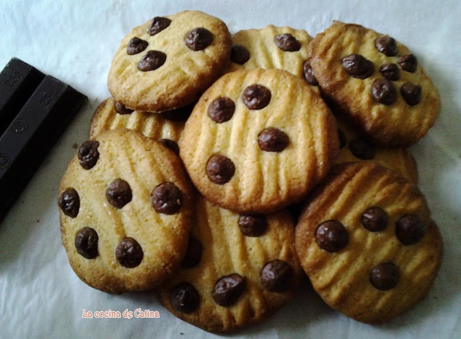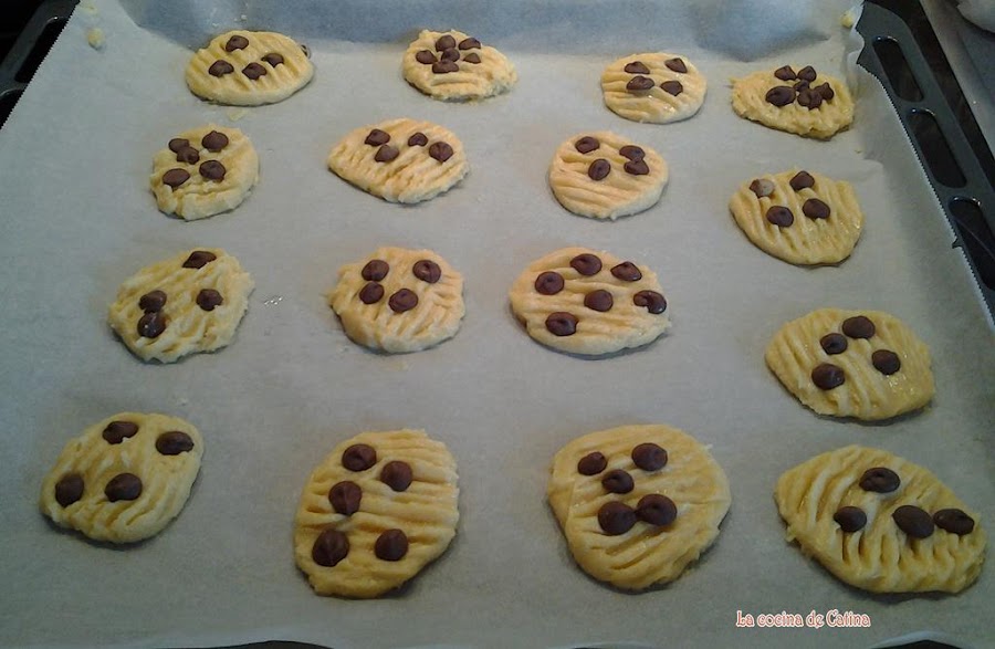 Las aplastamos un poco con un tenedor húmedo y repartimos las pepitas de chocolate. Horneamos entre 8 y 10 minutos.
