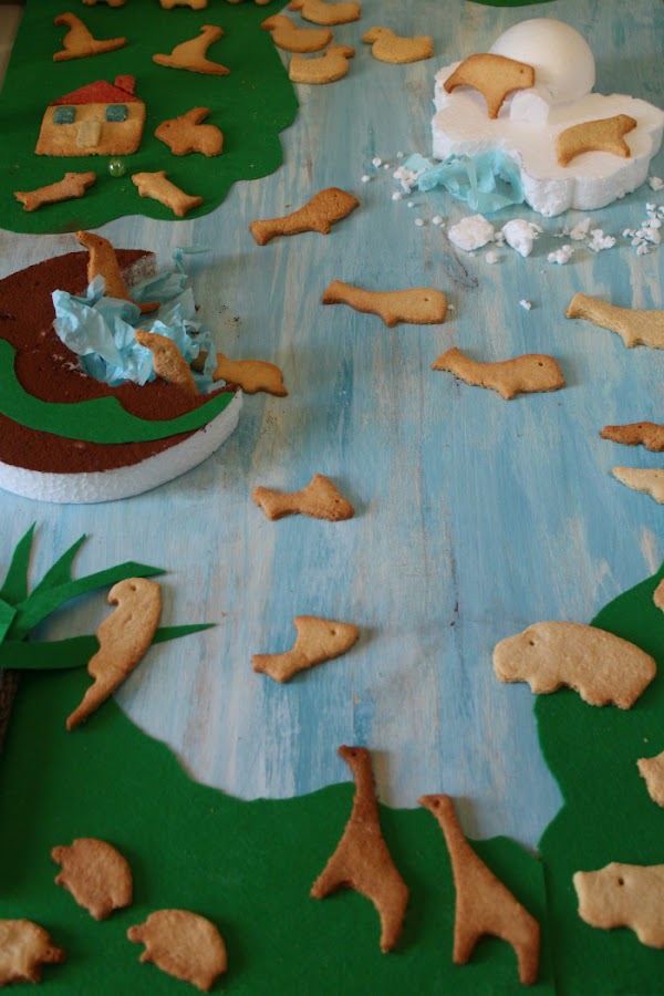 Ahora bien, mis hijas tienen 10 y 13 años, y en vez de recortar y colorear los animales, pensaron en que sería más divertido preparar nosotras un tablero y hacer con corcho, fieltro y papel de seda los diferentes escenarios del juego.