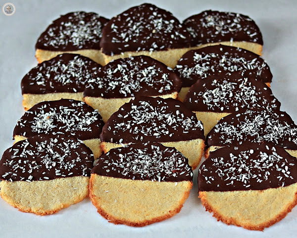 6.- Sumergir la mitad de la galleta en el chocolate y espolvorear un poco de coco rallado por encima.