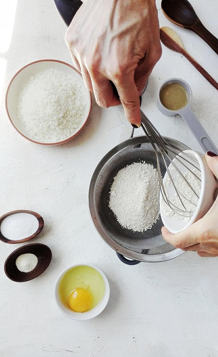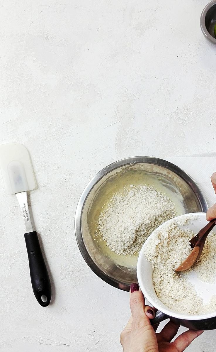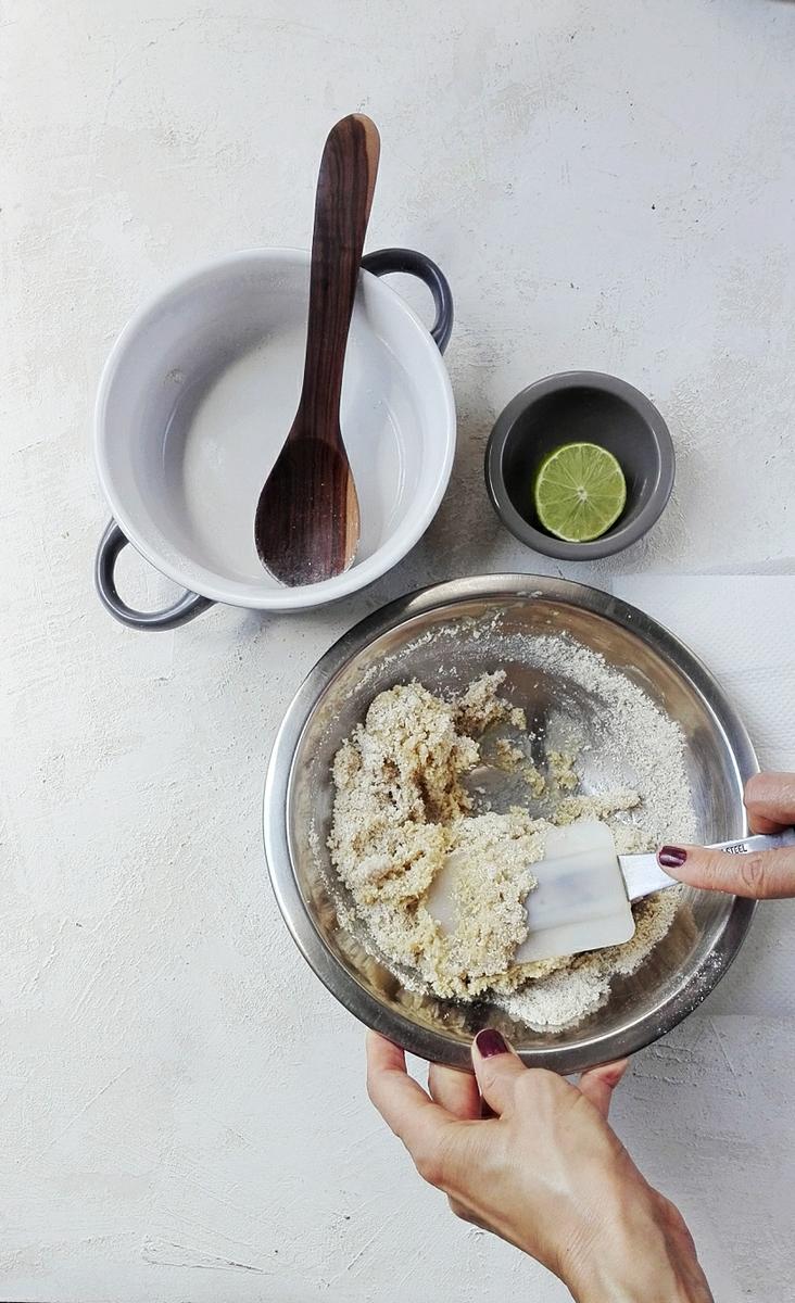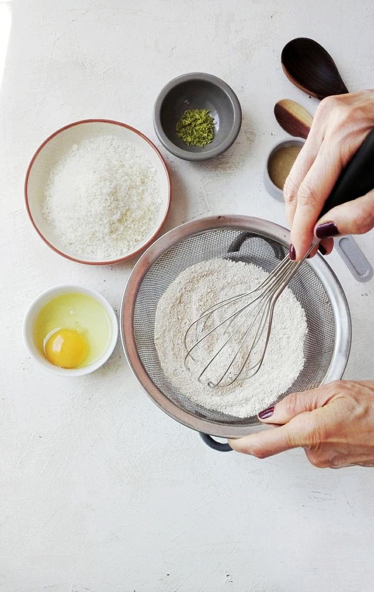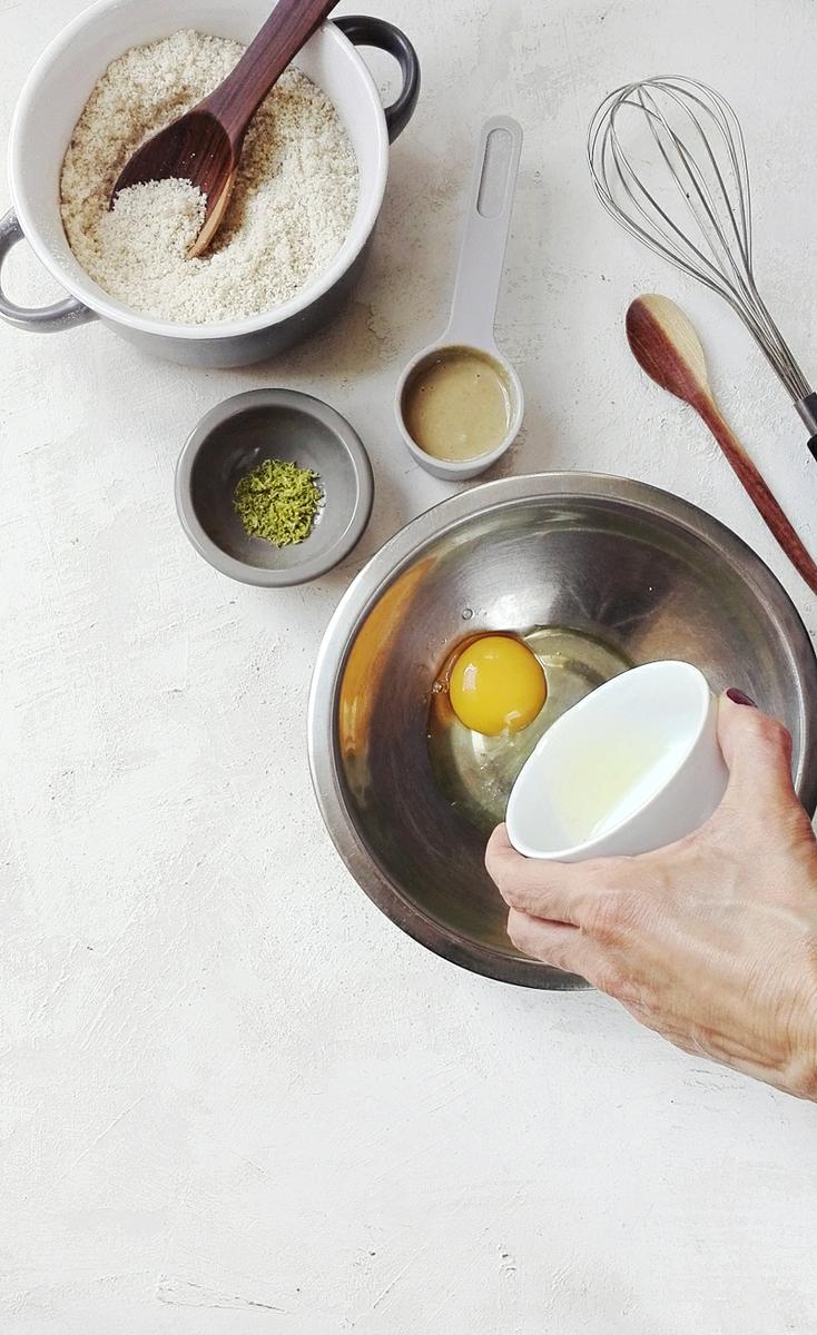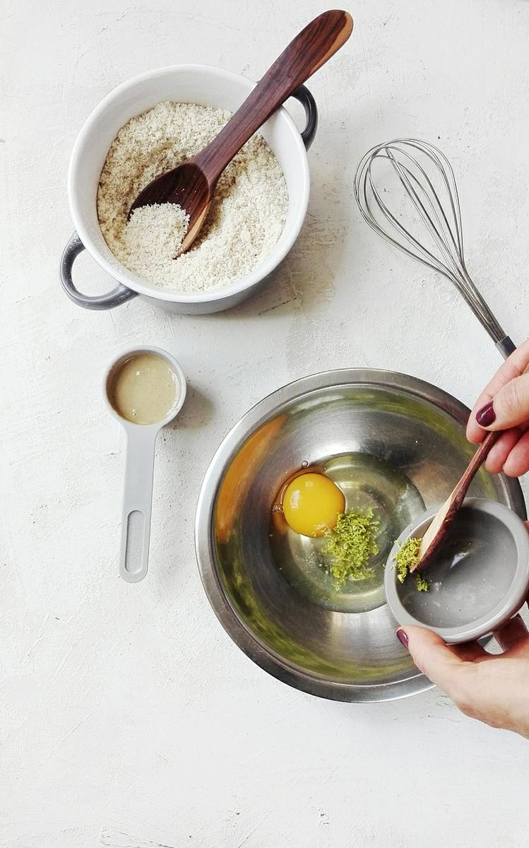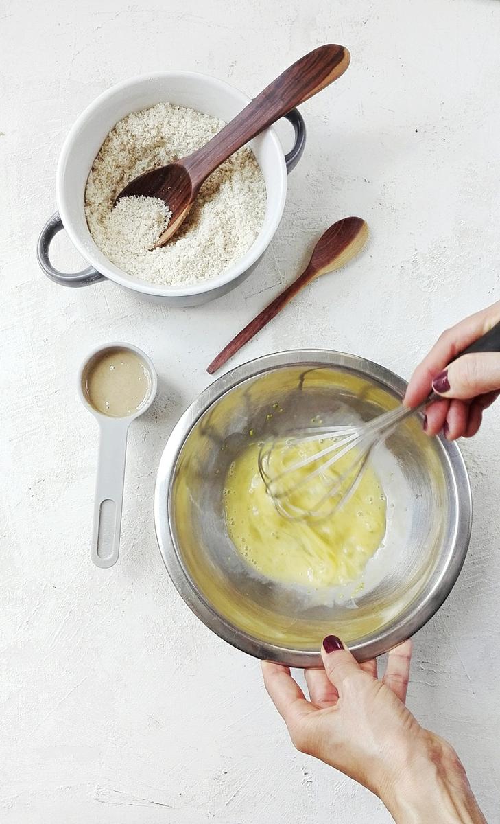 En otro bowl, mezclar el huevo con el tahine y batir hasta que se integren. Agregar la ralladura de limón y mezclar todo.