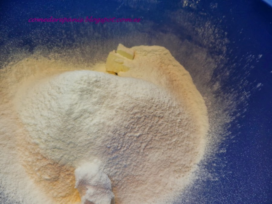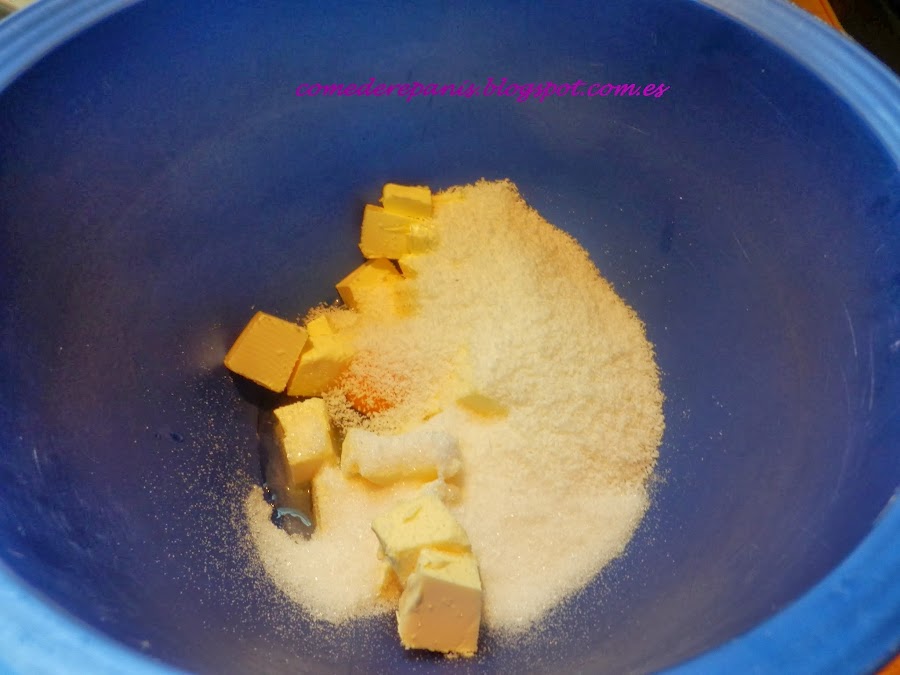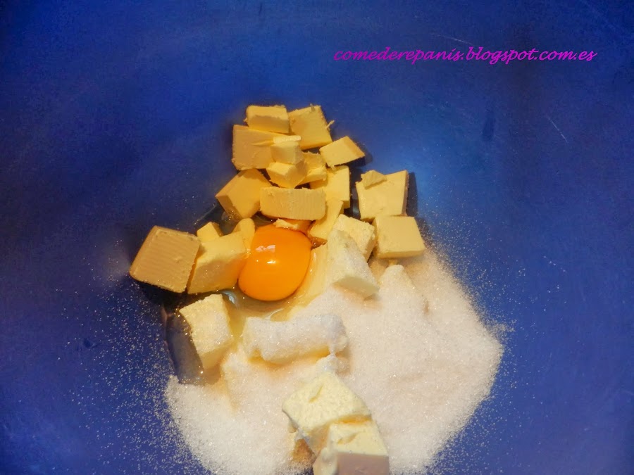 En un bol colocamos la mantequilla en dados, el huevo y el azúcar.
