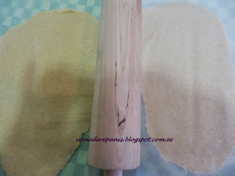 Cuando nuestra masa este lista preparamos dos papeles de horno y la colocamos sobre uno, con el otro la tapamos y estiramos con el rodillo. Deberemos estirarlas para que tengan un grosor de medio centímetro aproximadamente o algo más.