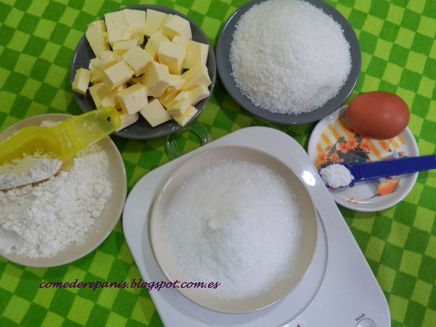 Mi afición a los corta-pastas para galletas es relativamente recientes, antes les daba forma con las manos, ahora todo es mucho mas fácil. Y desde que mi marido se ha dado cuenta el poco tiempo que tardo en preparar galletas se ha propuesto tardar lo mismo o menos en devorarlas, lo estoy empezando a ver algo azul, ¿se estará convirtiendo en un monstruo de las galletas? Por este motivo voy probando nuevas recetas y agregando nuevos ingredientes, el de hoy ha sido el coco, que puede fallar con coco, creo que nada.
