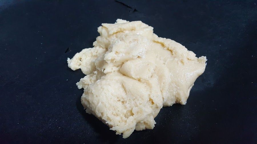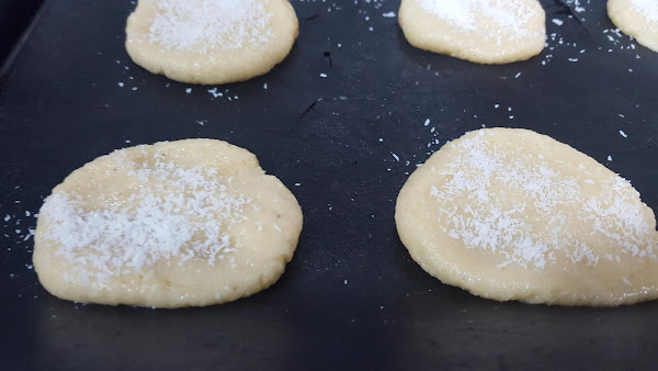4.- Volcamos la masa en un bol y vamos haciendo bolitas, que luego aplanaremos en la bandeja de hornear y espolvoreamos con coco rallado.