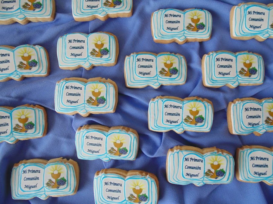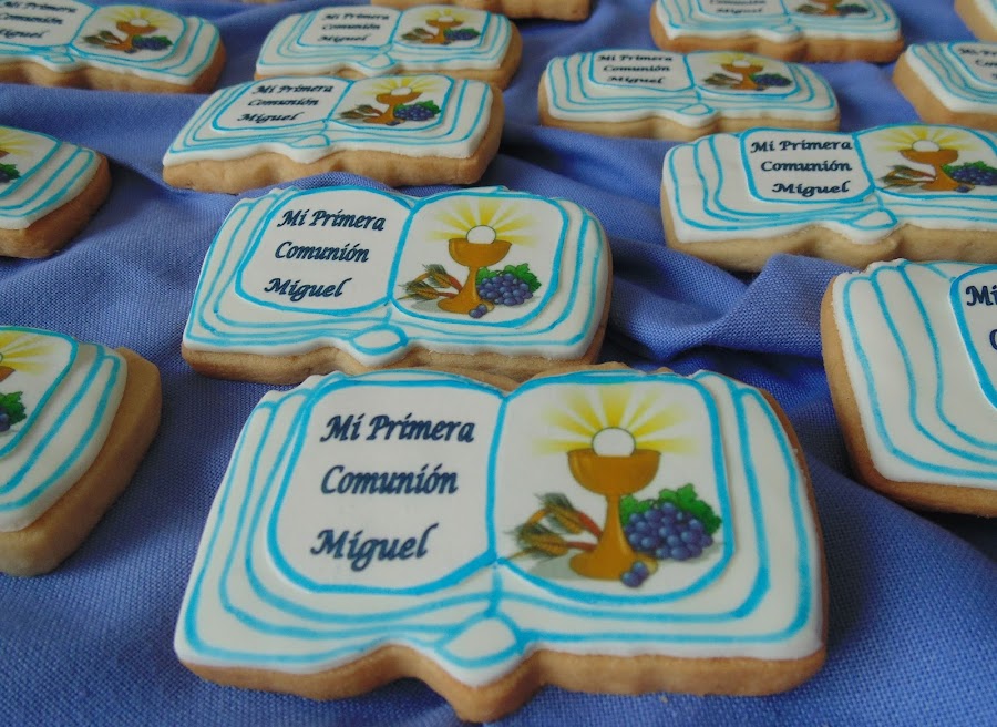 Hace más o menos un año os enseñamos a hacer unas galletas de comunión que a todo el mundo le gustan. Pero es cierto que requieren de tiempo, paciencia y un poco de habilidad para trabajar el fondant. Las que os traigo hoy son mucho más fáciles de hacer, y por eso me ha parecido que valía la pena enseñarlas. La receta de galletas es la misma y para cortarlas utilizamos un molde con forma de libro. Una vez tenemos las galletas horneadas y frías, estiramos fondant blanco con el rodillo y lo cortamos utilizando el mismo molde con el que hicimos las galletas. Cubrimos cada galleta con el fondant adhiriéndolo con un poco de pegamento comestible o con un poco de glasé. Después colocamos sobre cada galleta una impresión comestible, en papel de azúcar con el dibujo o la leyenda que queramos.