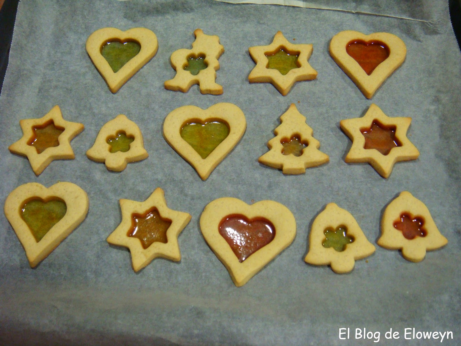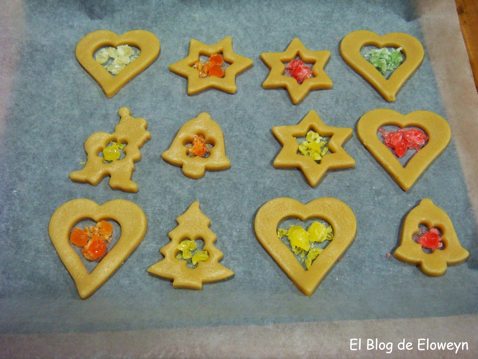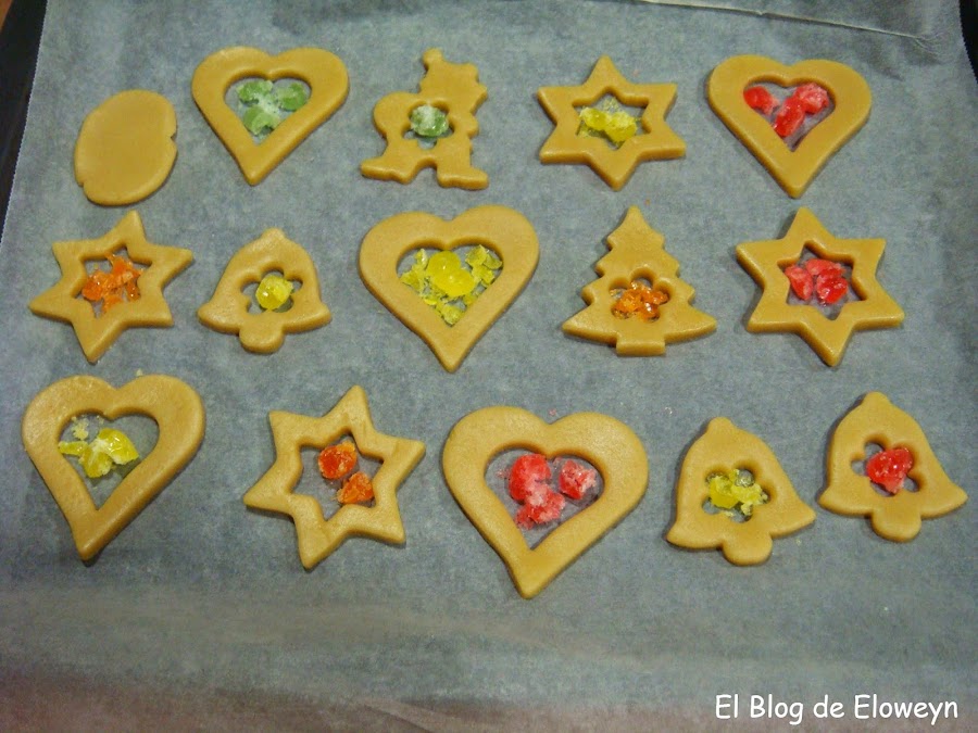 Eso sí. Procurad que los caramelos que uséis sean de colores vivos. De esta forma, cada galleta tendrá un color diferente. Si son colores apagados, todas las galletas parecerán del mismo color y no quedará bien.