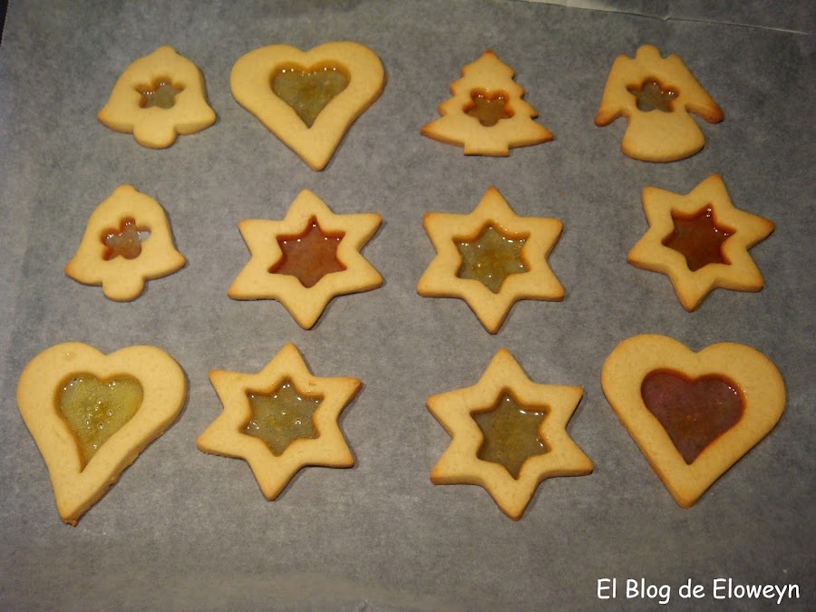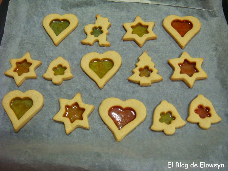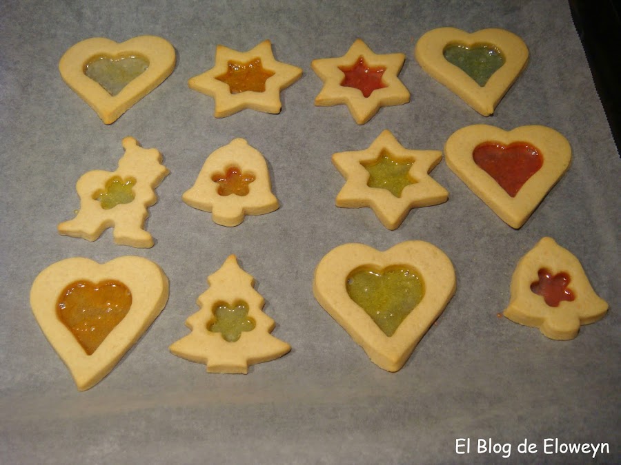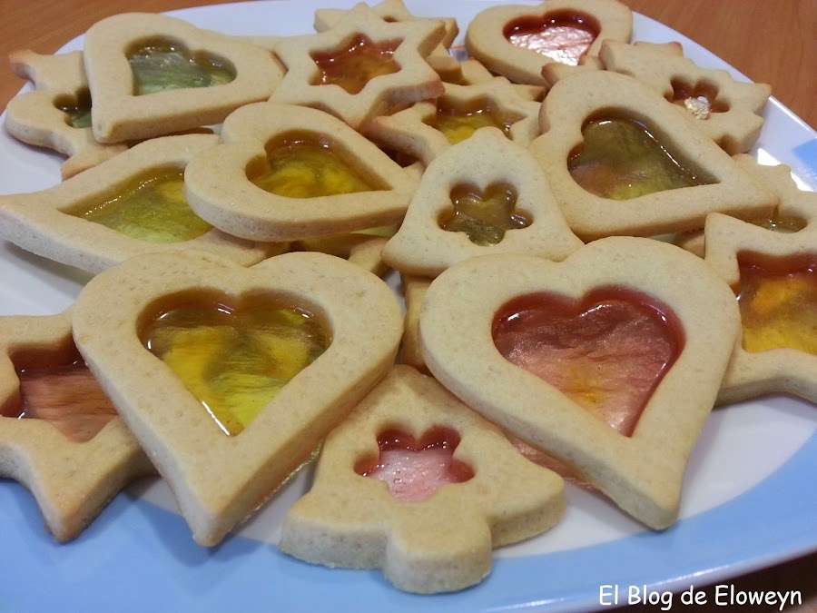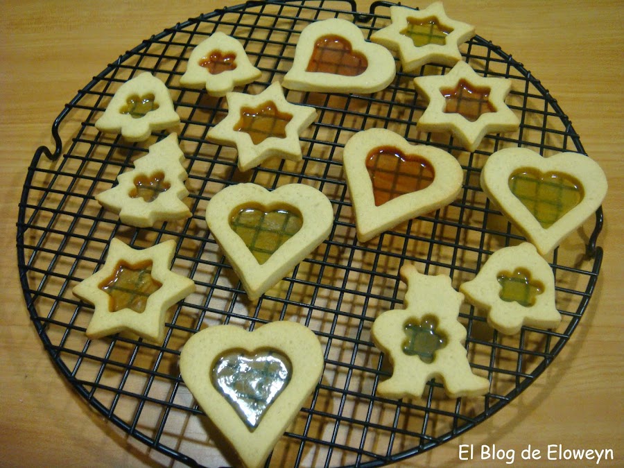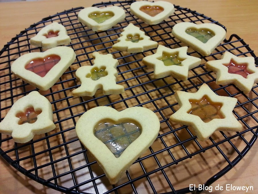 ¡Pues sí! Son galletas de cristal. ¿Y por qué ese nombre? Porque en el centro tienen una capa muy fina de caramelo, y son transparentes al contraluz. De hecho, cuando las muerdes, se agrietan de forma parecida al cristal. Son ideales para hacerlas en navidad. Se hace un agujerito arriba de la galleta usando una pajita y poniendo un cordel que atraviese el agujero se pueden colgar en el árbol. De esta forma, quedan muy bonitas puestas en el árbol y con las luces encendidas.