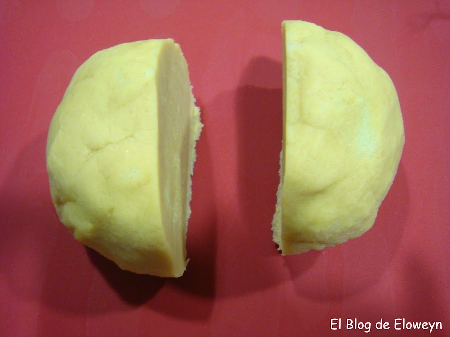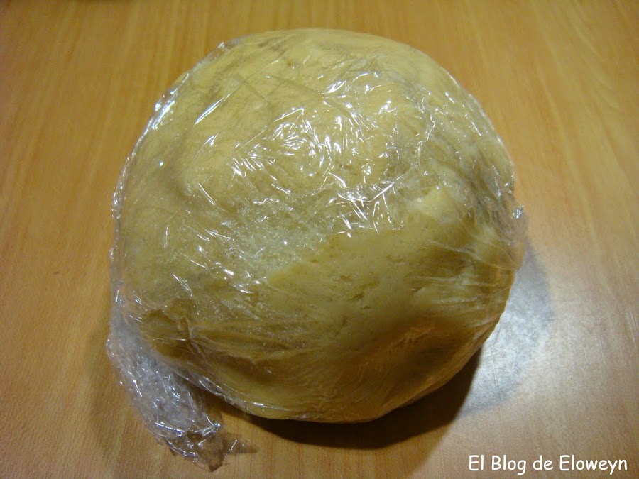 Como la bola está todavía fría, envolver una de las partes en papel film y dejarla en la nevera de momento. Iremos trabajando con sólo la mitad de la masa. No debéis de olvidar que esta masa lleva bastante mantequilla, y cuando se lleva un rato trabajando con ella, se vuelve más blandita, hasta llegar a un momento que no se puede trabajar con ella.