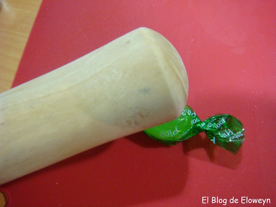 En mi caso, usé más o menos la mitad de caramelo para los agujeros grandes, y un poquito más de un cuarto para los pequeños. Para partir el caramelo, usad el mango de un mortero y dadle unos cuantos golpes, pero sin quitar el papel al caramelo. De esta forma no se os desparramará por ahí.