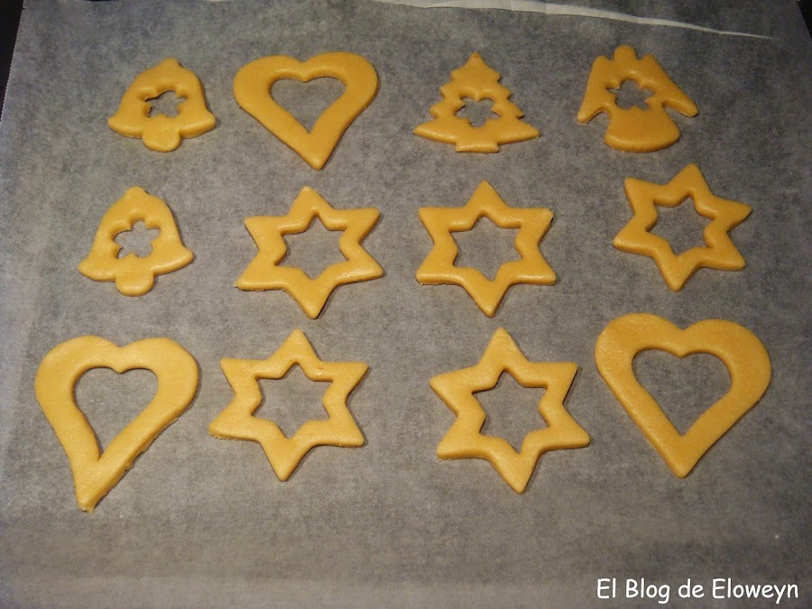 Usamos un cortapastas grande y luego otro más pequeño para hacer el agujero. Puede ser de la misma forma pero diferente tamaño, o de diferentes formas. Si lo hacéis por navidad, podéis usar motivos navideños. Si lo hacéis por San Valentín, podéis usar corazones. Vosotros mismos :)