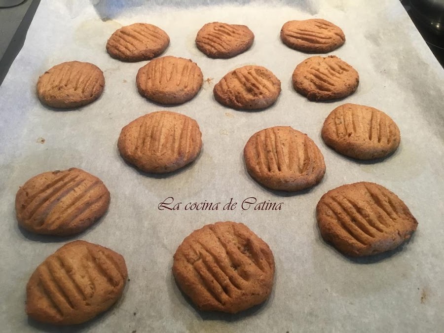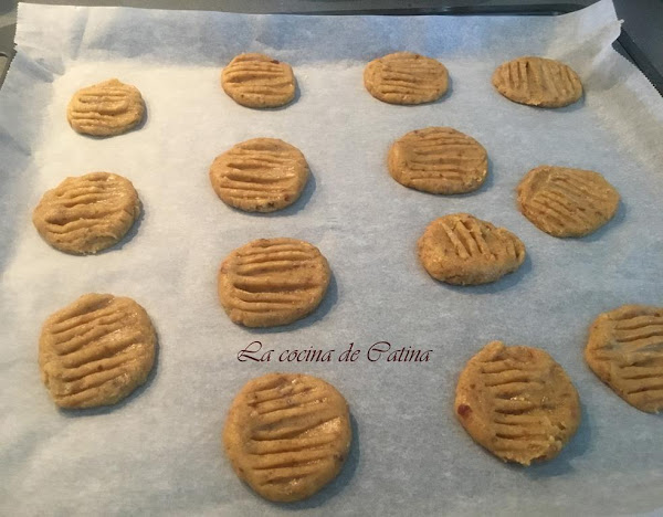 Con la ayuda de una cuchara, cogemos porciones de la masa y hacemos bolas, que colocaremos sobre la bandeja del horno cubierta esta con papel sulfurizado. Le damos forma de galleta y las aplastamos con un tenedor.
