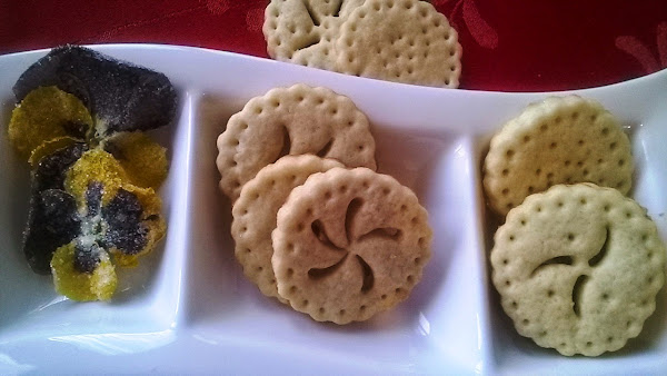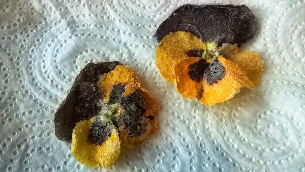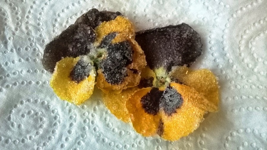 Estos son pensamientos cristalizados... que los hice el otro día..ya te explicaré cómo se hacen. Está muy de moda comer flores..