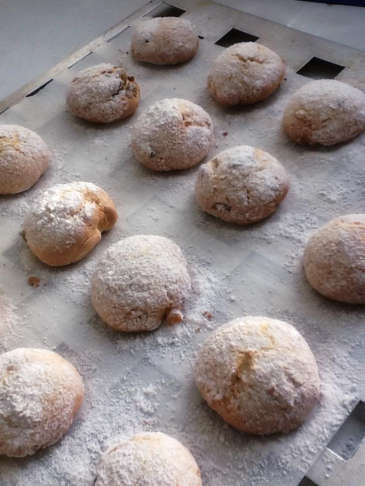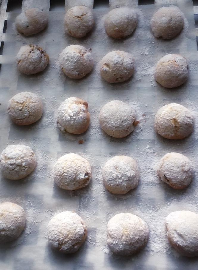Con las manos limpias cogemos porciones de masa, redondeamos y aplastamos ligeramente contra el azúcar glass pero que coja una buena cantidad.