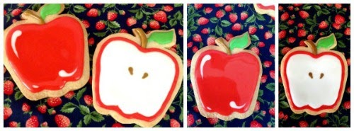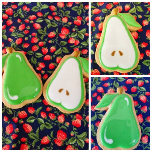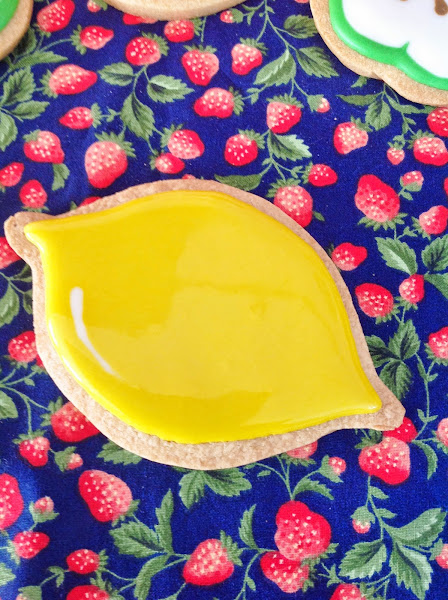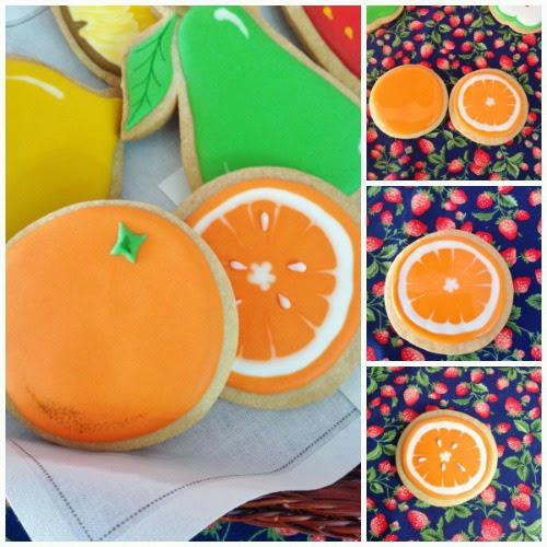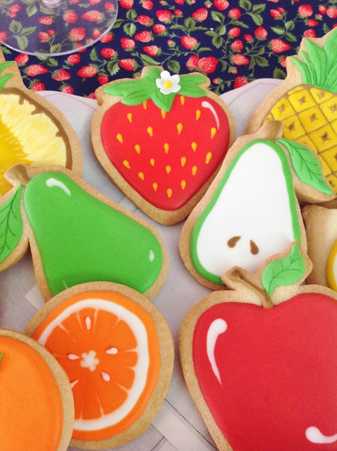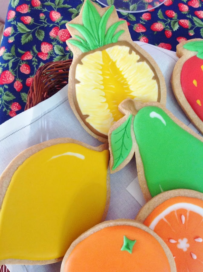 Os voy contando poco a poco cómo las hice. Por supuesto mi receta infalible de galletas para decorar y mi receta de glasa a la que le di consistencia media para no tener que perfilar y luego rellenar. Me gusta mucho cómo quedan las galletas sin perfiles. Los colorantes que usé son los del pack de Wilton. Como lleva los colores básicos, que son los que quería para la fruta, no tenía que quebrarme más la cabeza.