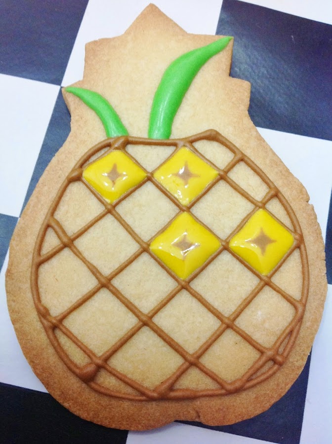 La piña es la que más trabajo me costó y la que menos me gustó como quedó. Primero hice el enrejado de marrón y cuando estuvo seco, empecé a rellenar los cuadrados de la forma que se ve en la imagen, dejando una fila sin rellenar para que no se mezclase la glasa entre ellos. Les puse un punto marrón en el centro y con un palillo hice como una estrella para que se asemejara más a la de verdad. Las hojas verdes las fue haciendo alternadas para que los perfiles se notaran.
