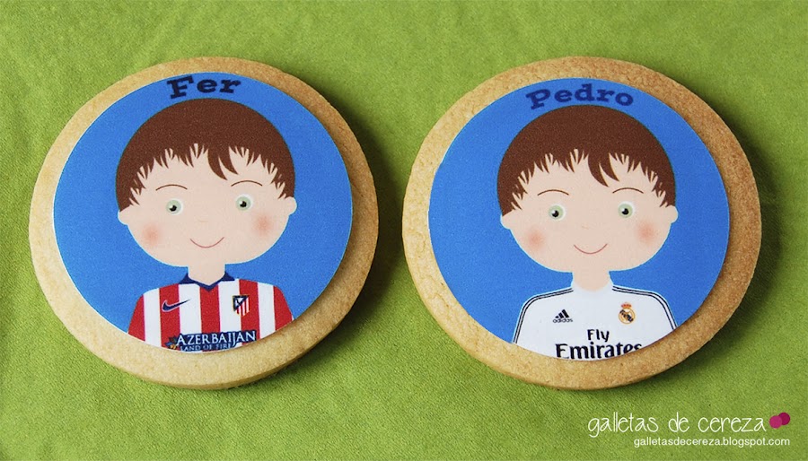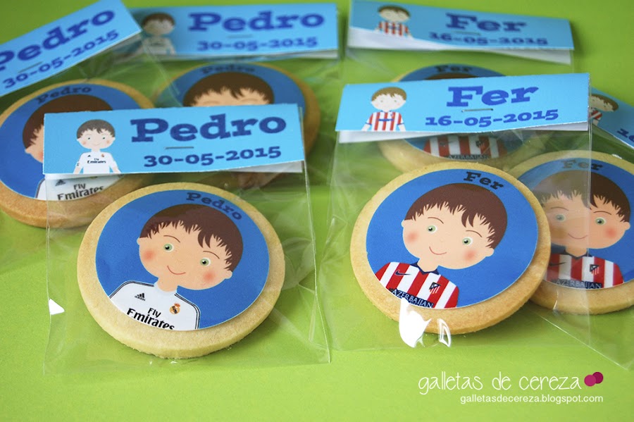 Era el sexto cumpleaños de Cesar y como buen seguidor del C.D. Leganés quería repartir entre sus invitados galletas con la nueva camiseta de la temporada 2015-2016 y balones de fútbol, y sus deseos se cumplieron. Las galletas eran de masa de chocolate y la decoración en fondant y rotulador comestible, imitando un balón de fútbol y la nueva camiseta del Leganés. Todas iban decoradas con el nombre ...