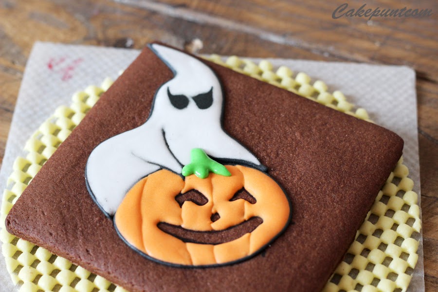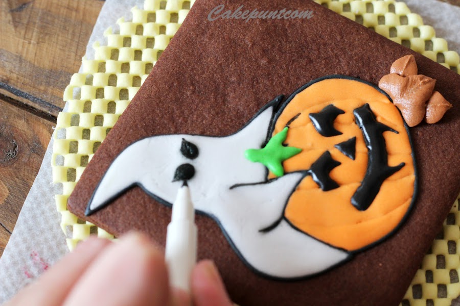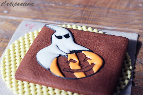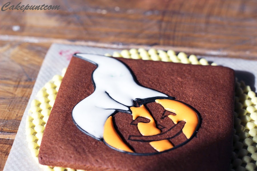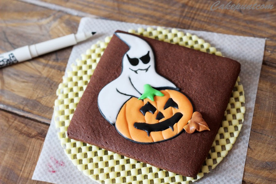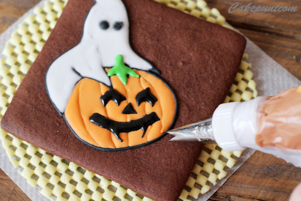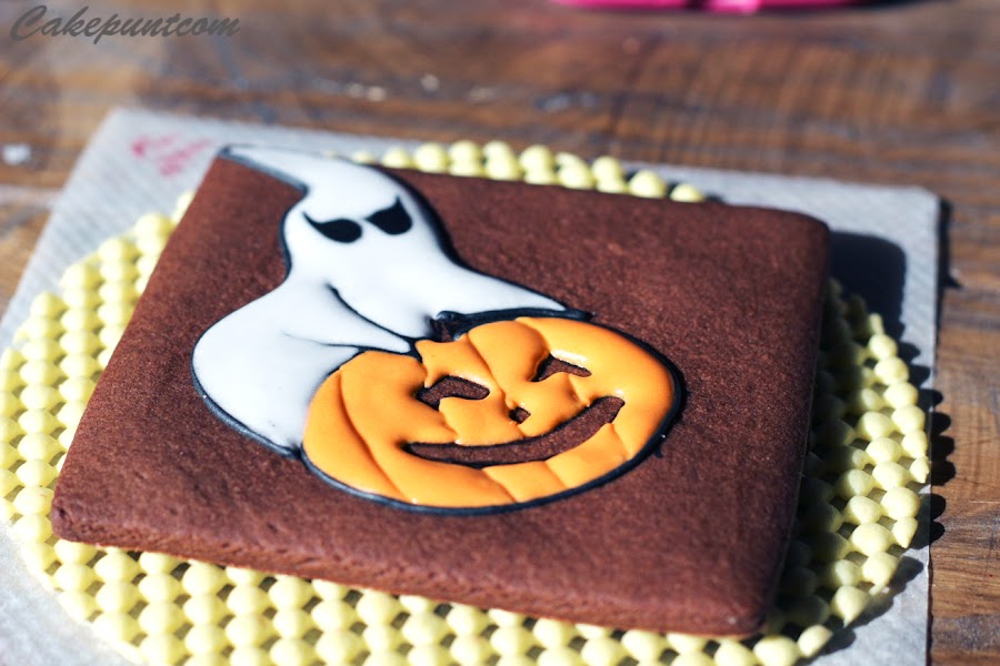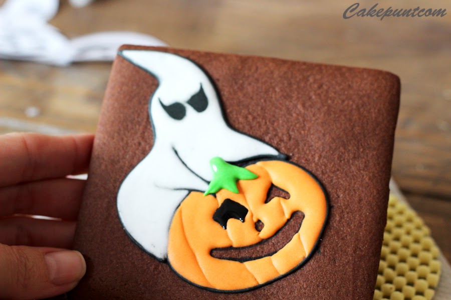Mientras esperamos que seque el naranja, rellenamos con glasa blanca (consistencia media) el fantasma.