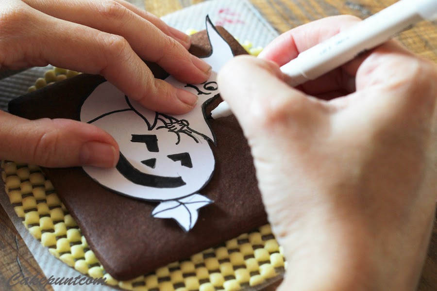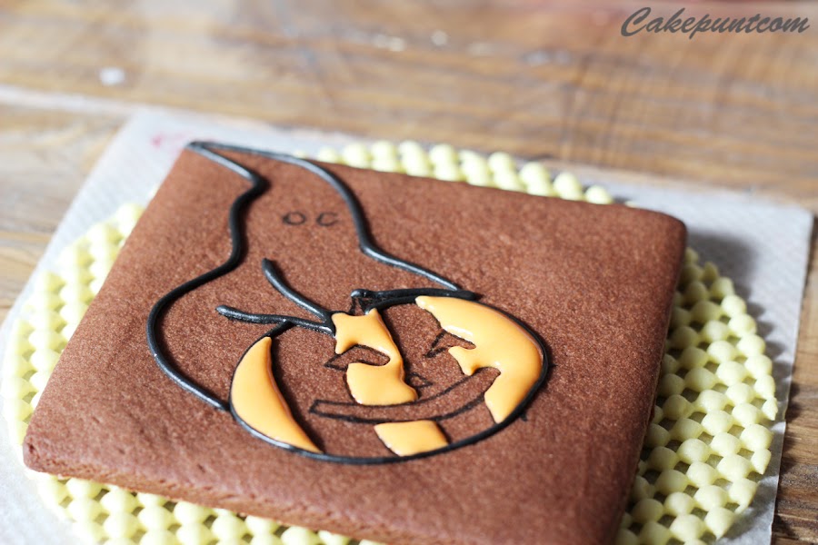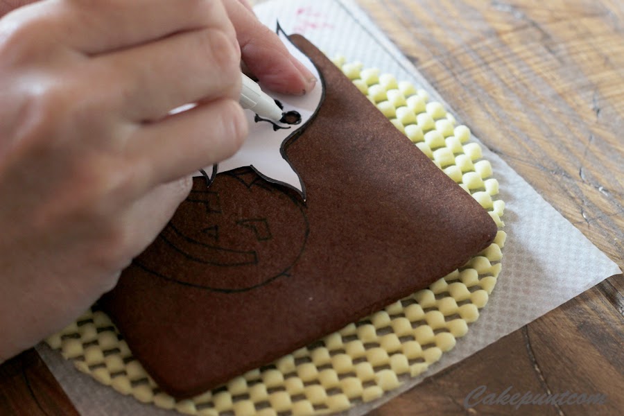 Una vez marcado el dibujo, cogeremos glasa negra de consistencia delineado y reseguiremos el dibujo-