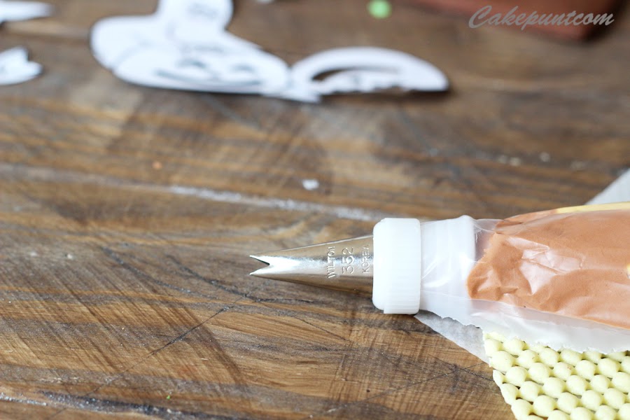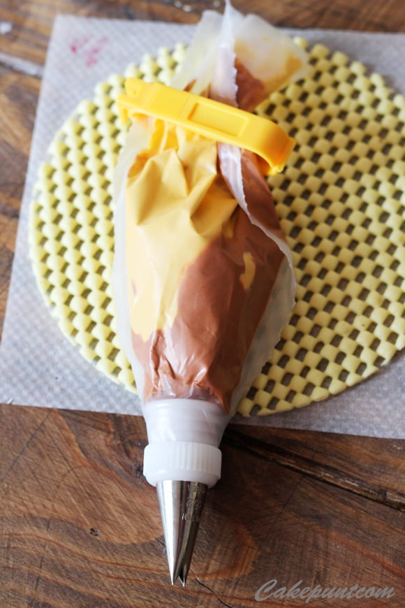 Con la consistencia de la glasa madre prepararemos los colores marrón y amarillo y los introduciremos en la misma manga pastelera con la boquilla de hoja 352.