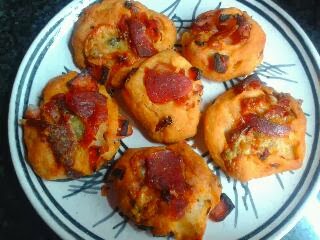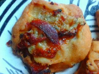Les ponemos una cucharadita de gorgonzola a cada una, presionándolo un poco en la masa y encima pegamos el jamón picado.