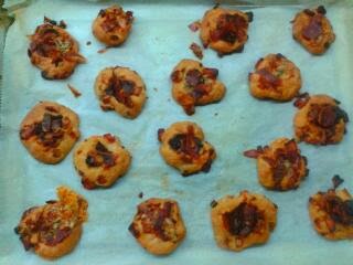 Con la misma masa base podemos hacer galletas de varios sabores: de foie, de cacahuetes, de york y queso,...en este caso son de jamón serrano, que se queda crujiente y un poco de gorgonzola.