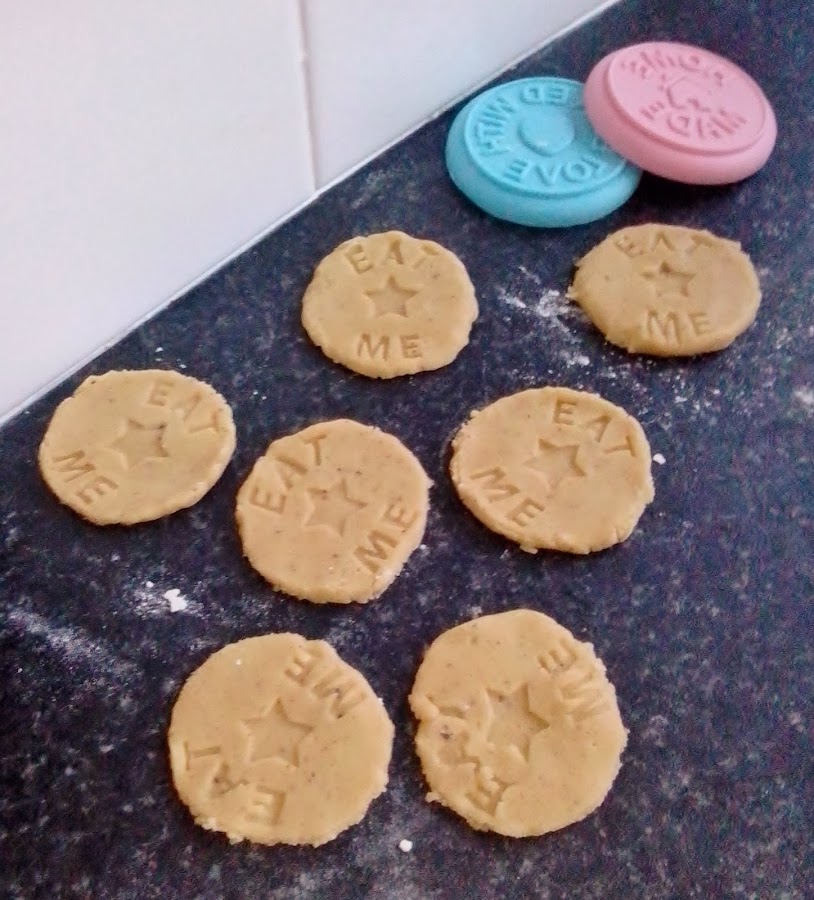 Cortamos las galletas con un cortapastas (o en su defecto, como fue mi caso, con un vaso), y les aplicamos el sello intentando que quede grabado por toda la galleta. Debemos tener cuidado de que los sellos siempre estén limpios y sin resto de masa pegados, ya que si no pueden romper nuestras galletas.