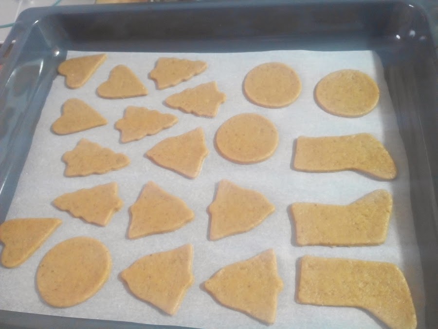 Con ayuda de un cortador que nos guste vamos haciendo las formas y las pasamos a una bandeja para horno con papel vegetal.