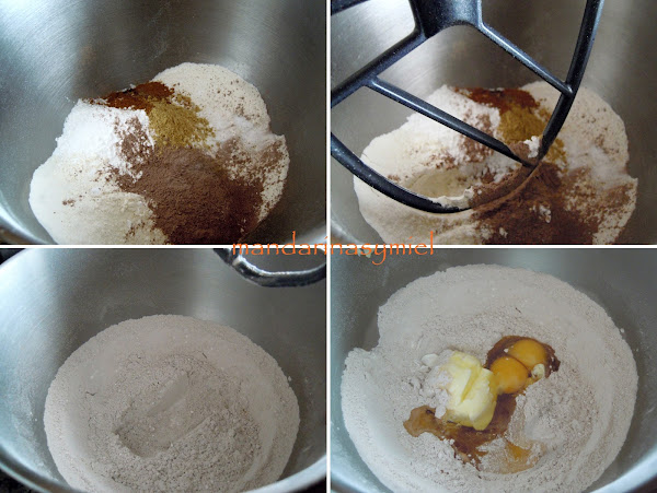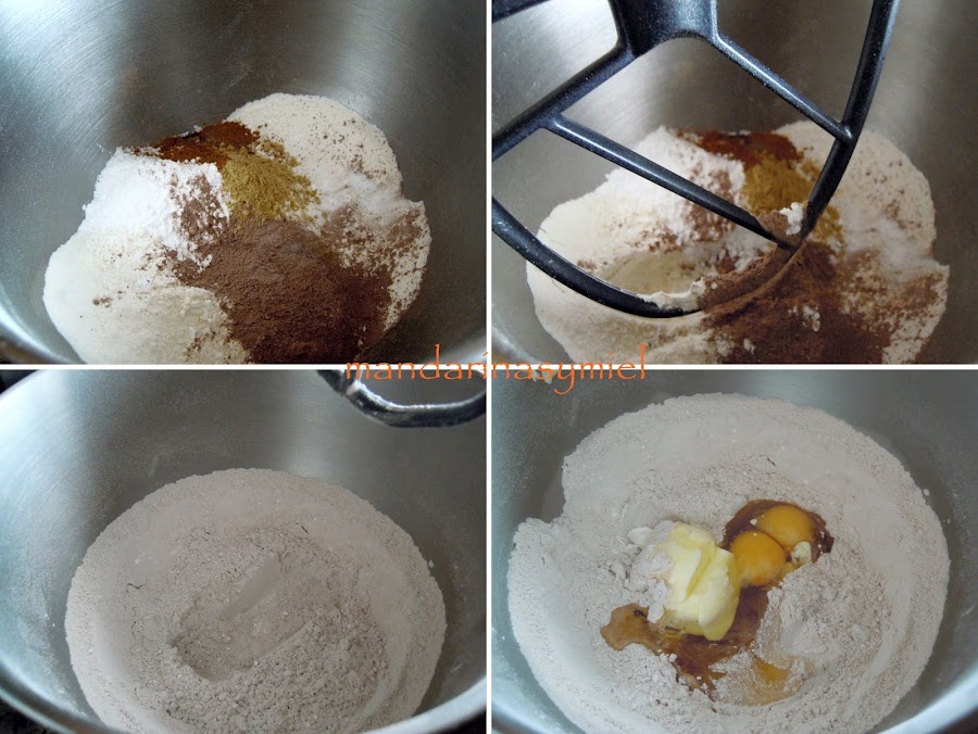 Pon en el bol de la amasadora la harina, el azúcar glass, el bicarbonato y el cacao todo tamizado, pasado por un colador, añade las especias.