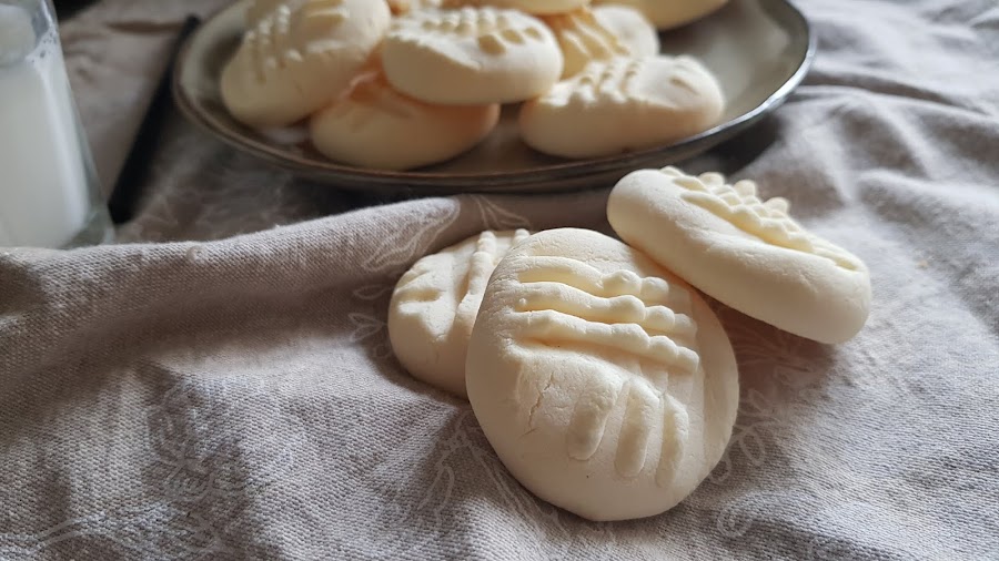 5. Metemos las galletas al horno precalentado a 160ºC durante unos 12-15 minutos. Estad atentos porque no tienen que llegar a dorarse, tienen que quedar más bien blanquitas, color crema. Sacamos las galletas del horno y las dejamos reposar sobre una rejilla hasta que se enfríen.