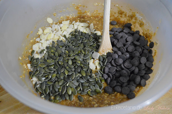 Por último, añade los frutos secos que hayas elegido que, en nuestro caso, fueron los mismos que Ana, las almendras y las semillas de calabaza, y las chips de chocolate. Remueve todo hasta que tengas una masa homogénea.