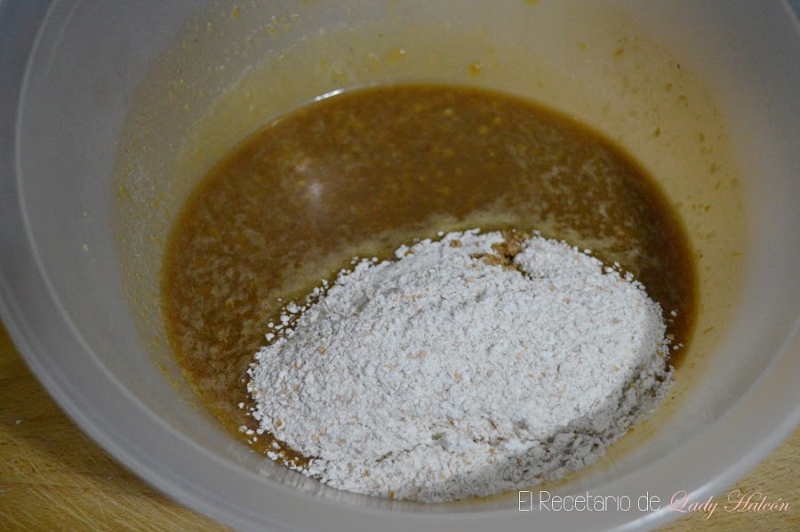 Continúa añadiendo el huevo ligéramente batido, la harina integral, el bicarbonato y la vainilla y remueve para mezclarlo todo.